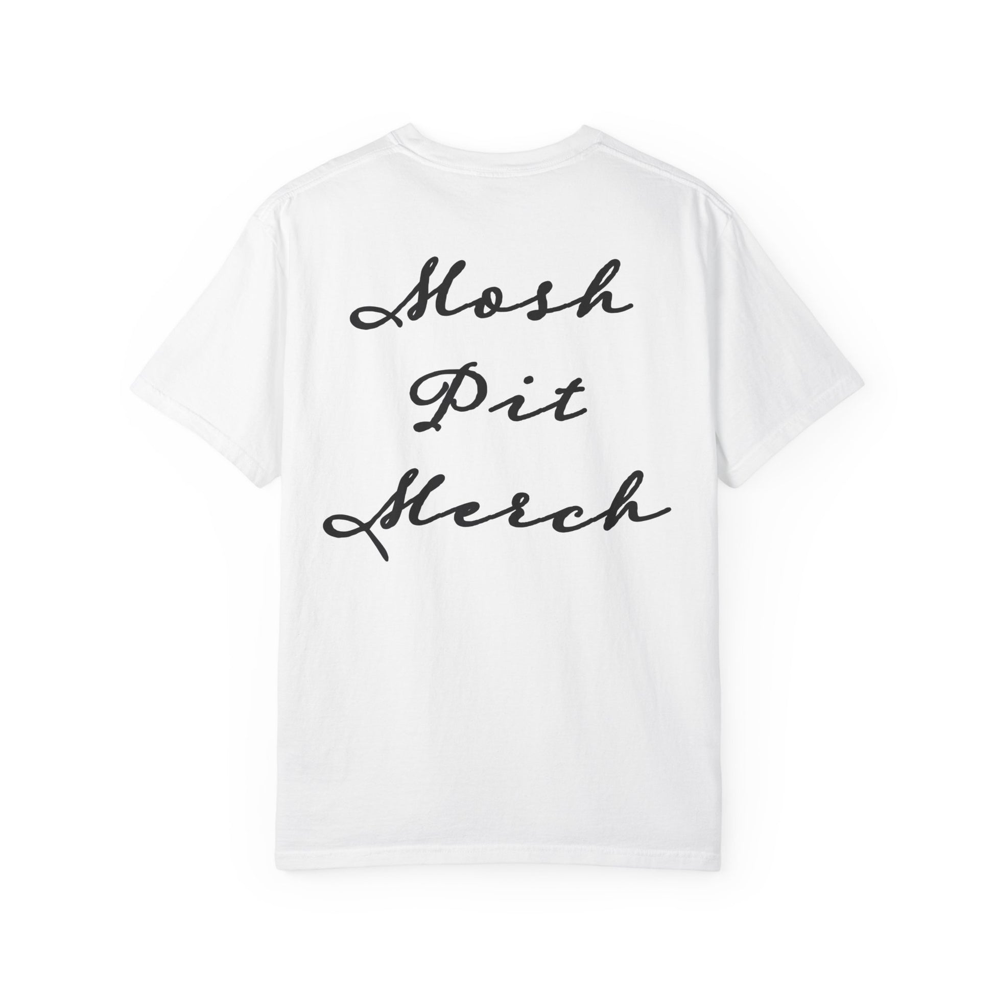 An edgy Mosh Pit Merch bull logo inspired by the Ferrari logo adorns this garment-dyed T-shirt, giving off a cool and rebellious vibe. Perfect for music enthusiasts, rock concert-goers, and fans of streetwear fashion. Ideal for occasions like music festivals, concerts, and casual hangouts with friends.