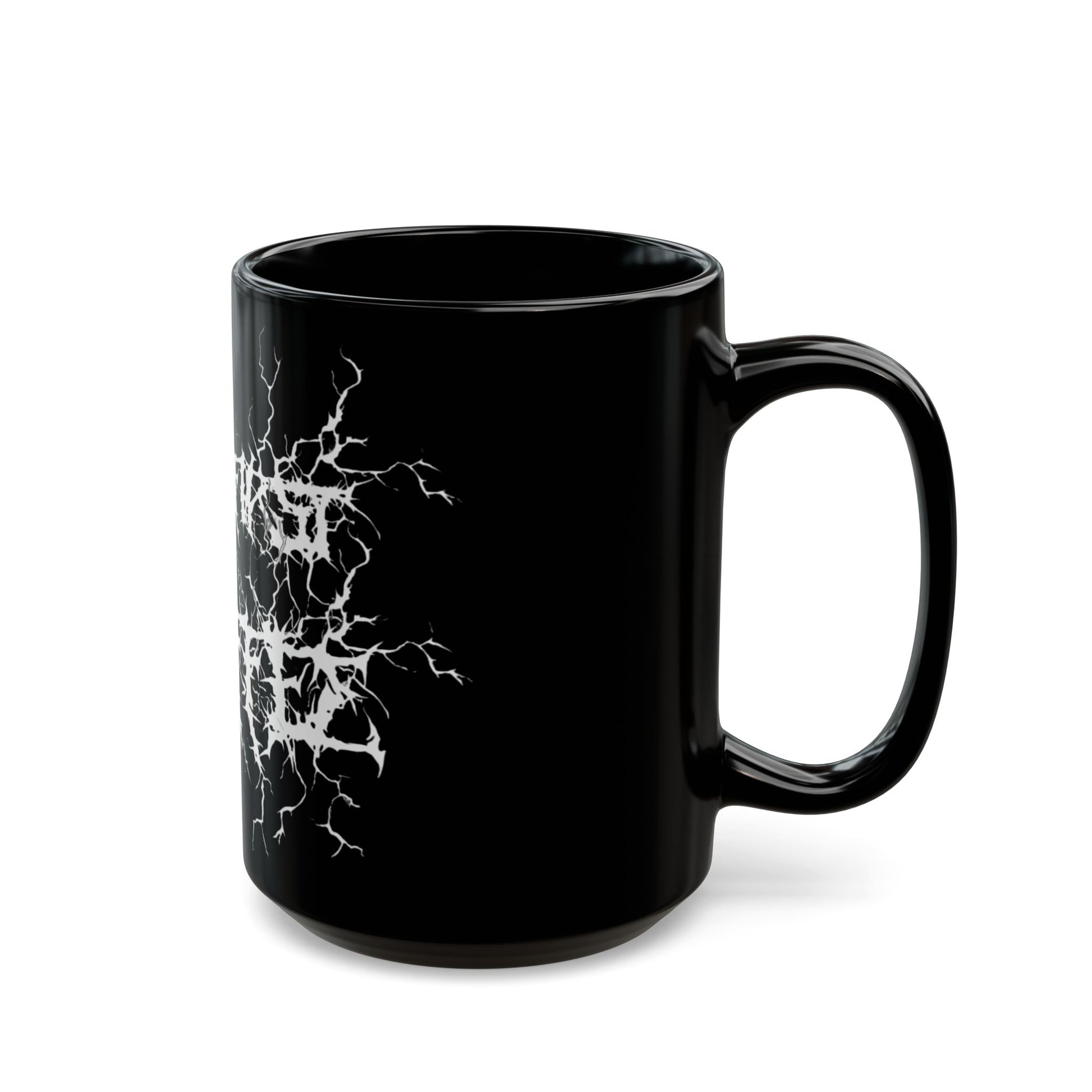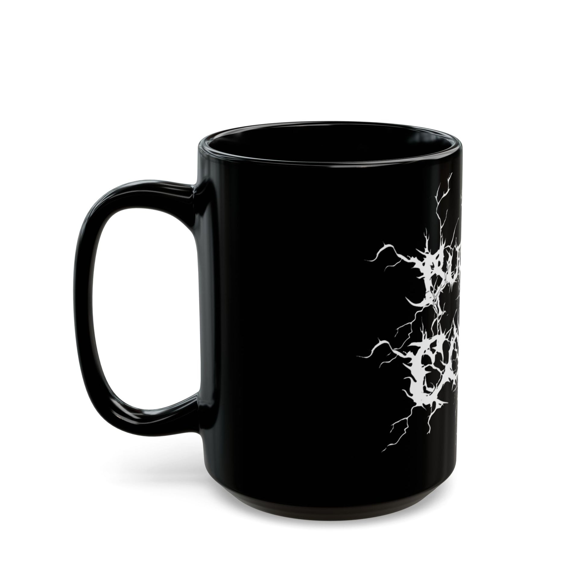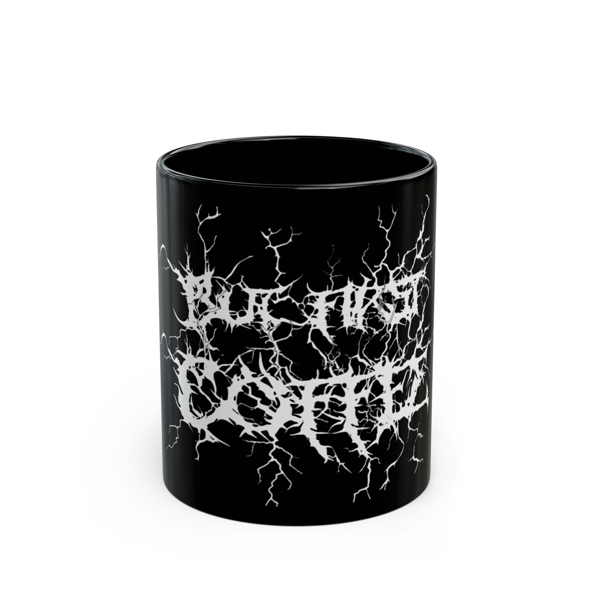 A sleek black mug featuring the phrase 'but first Coffee' in a death metal font. Perfect for coffee lovers who enjoy a bold and edgy style. Great for starting your day with a kick and adding a touch of attitude to your morning routine. Ideal for coffee enthusiasts or heavy metal fans.