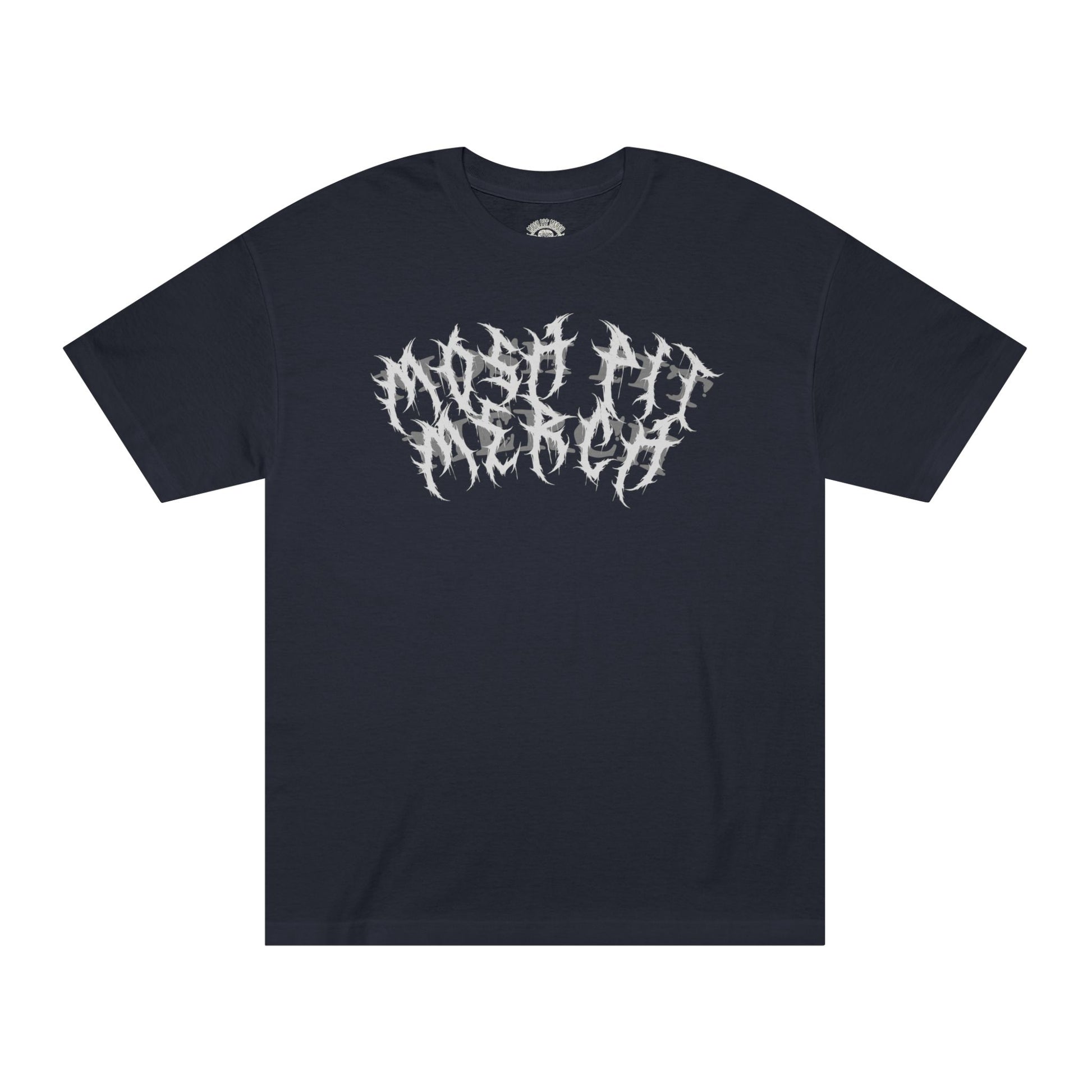 Mosh Pit Merch logo tee with death metal font, giving off a hardcore and edgy vibe. Perfect for metalheads looking to showcase their love for the genre. Ideal for concerts, music festivals, and casual everyday wear.