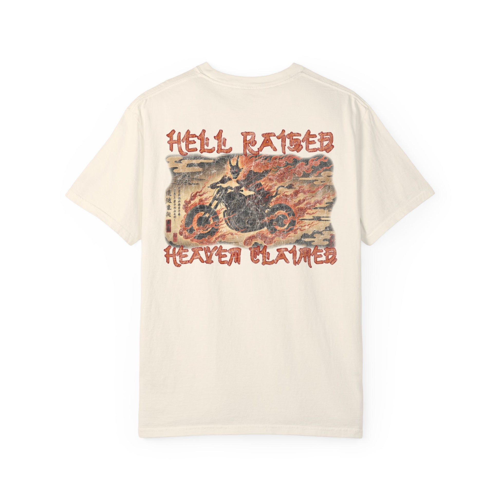 A powerful and symbolic T-shirt featuring a design of a person escaping hell while still in flames with the words 'Hell Raised Heaven Claimed', symbolizing redemption and faith. This tee is perfect for those who love Jesus & resonate with themes of spirituality and overcoming struggles. Ideal for those looking for a unique and meaningful statement piece to wear during casual outings.