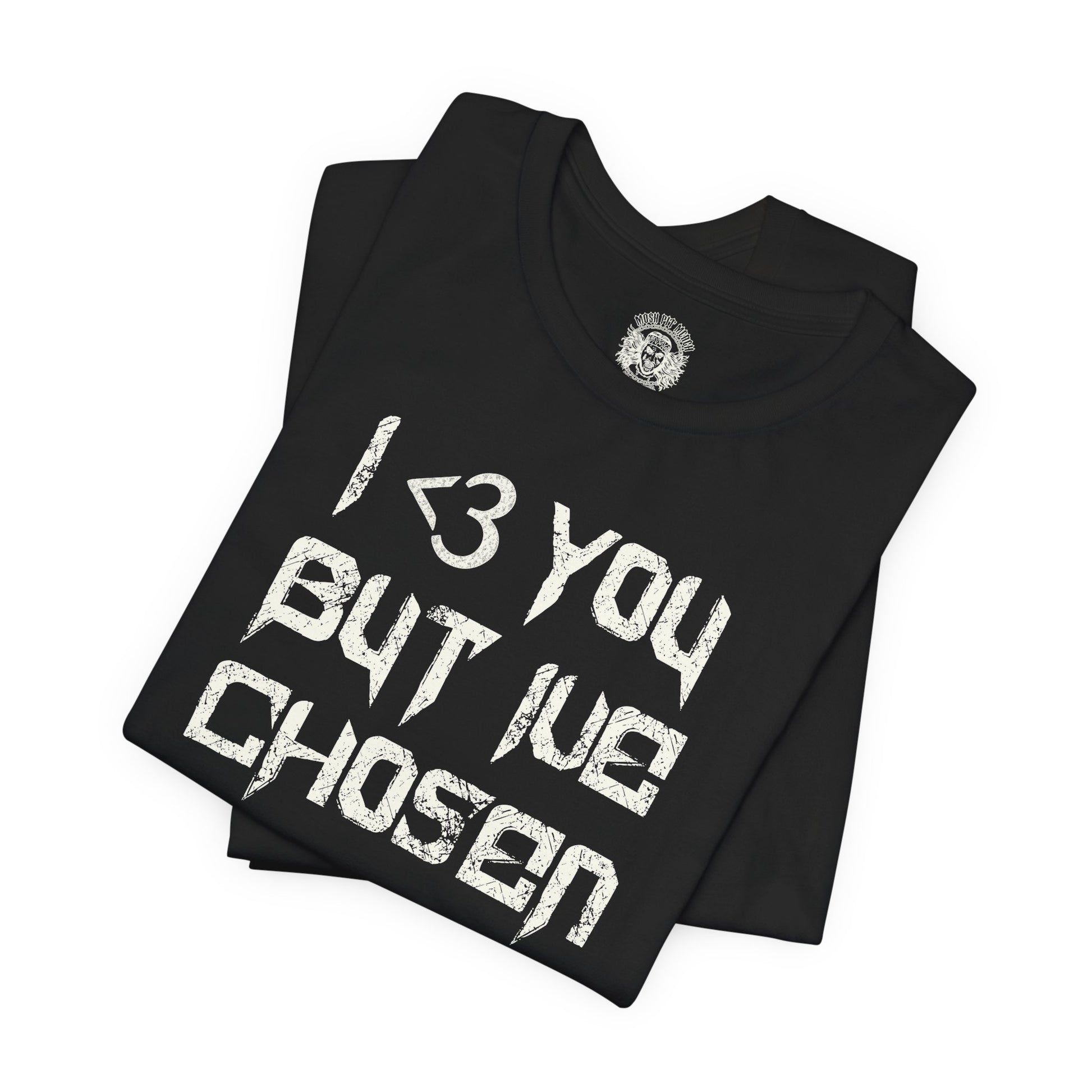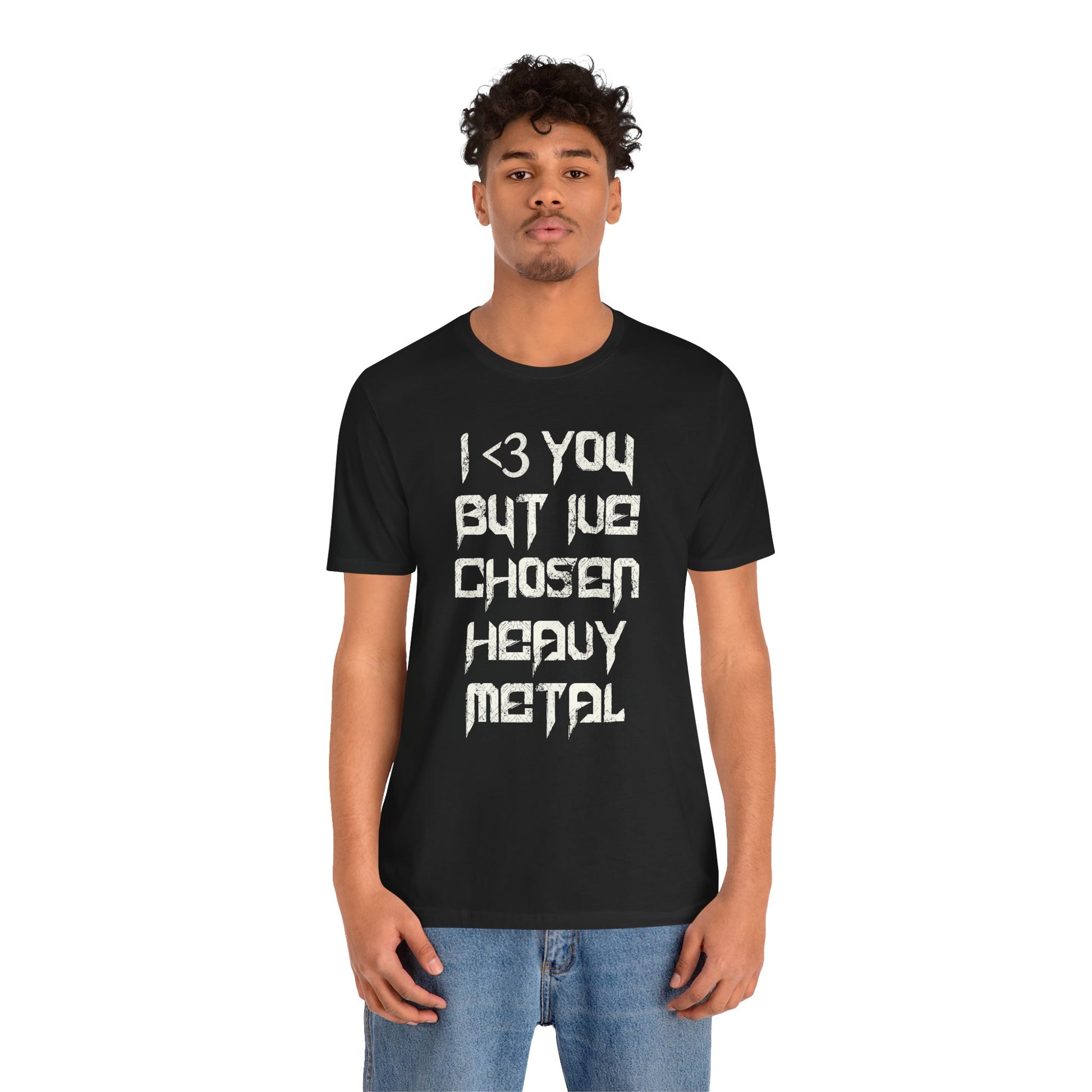 This T-Shirt features a bold statement that says 'i love you but ive chosen heavy metal' on the front, with the grim reaper throwing up the peace sign on the back. It gives off a rebellious and humorous vibe, perfect for music lovers and those with a quirky sense of style. Ideal for casual wear, concerts, and music festivals.