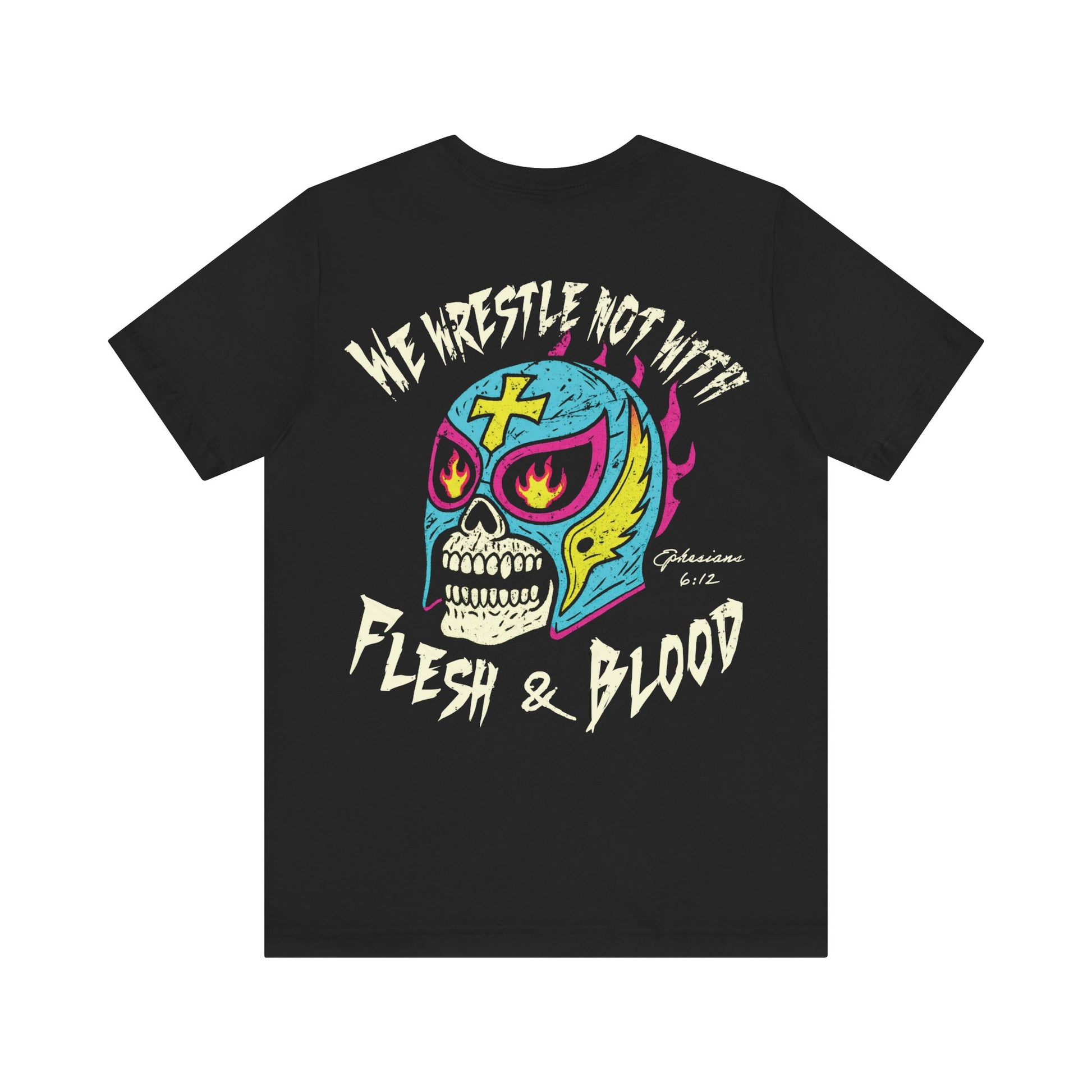 A luchador design shirt that embodies strength and resilience, perfect for those who appreciate wrestling themes.features a paraphrased Ephesians 6:12 verse around the luchador skull design on the back. Ideal for casual wear or as a statement piece in any wardrobe, this tee is a unique addition to any collection. Relevant for fans of wrestling, martial arts, or those seeking a bold and edgy look. Great for gifting on birthdays, holidays, and special occasions.