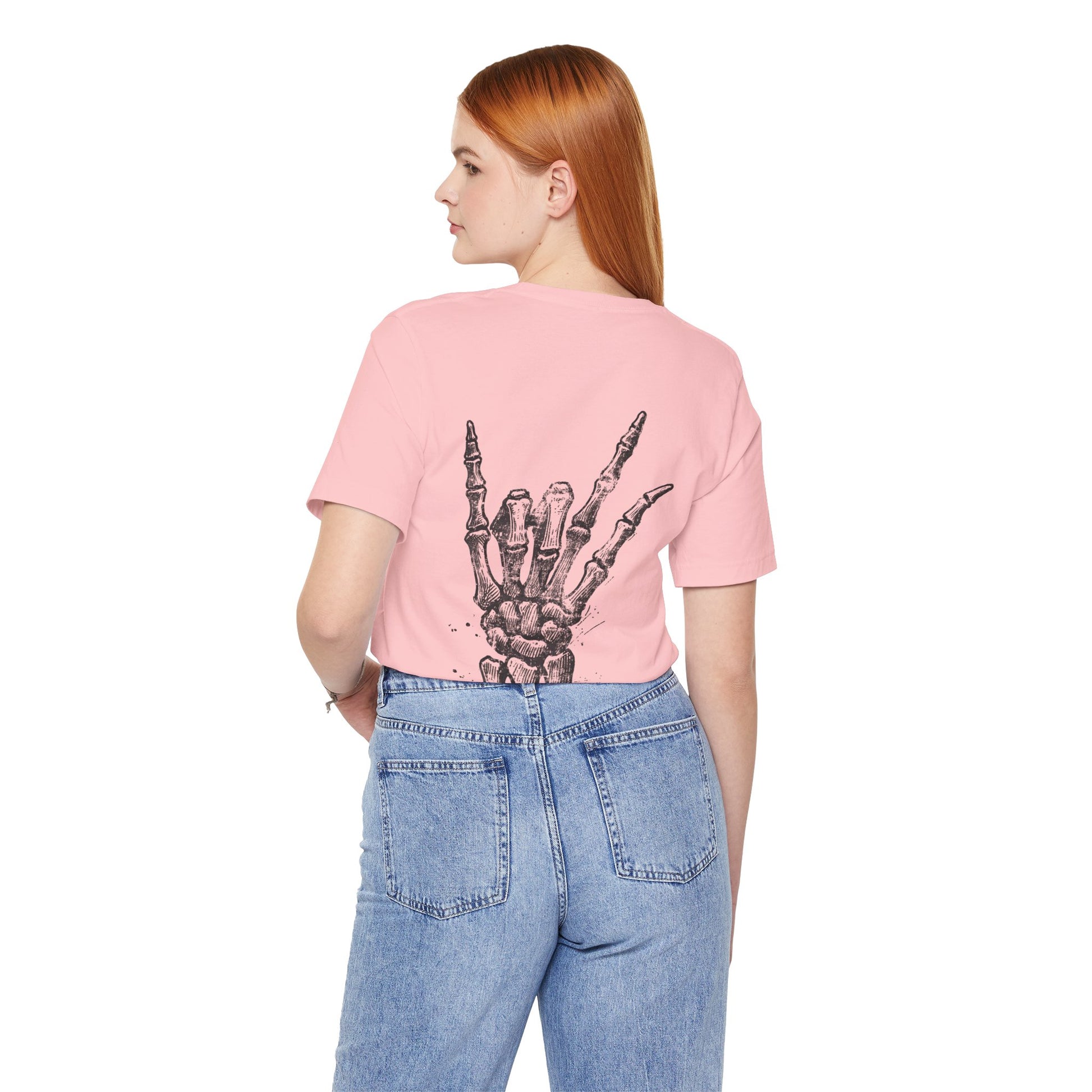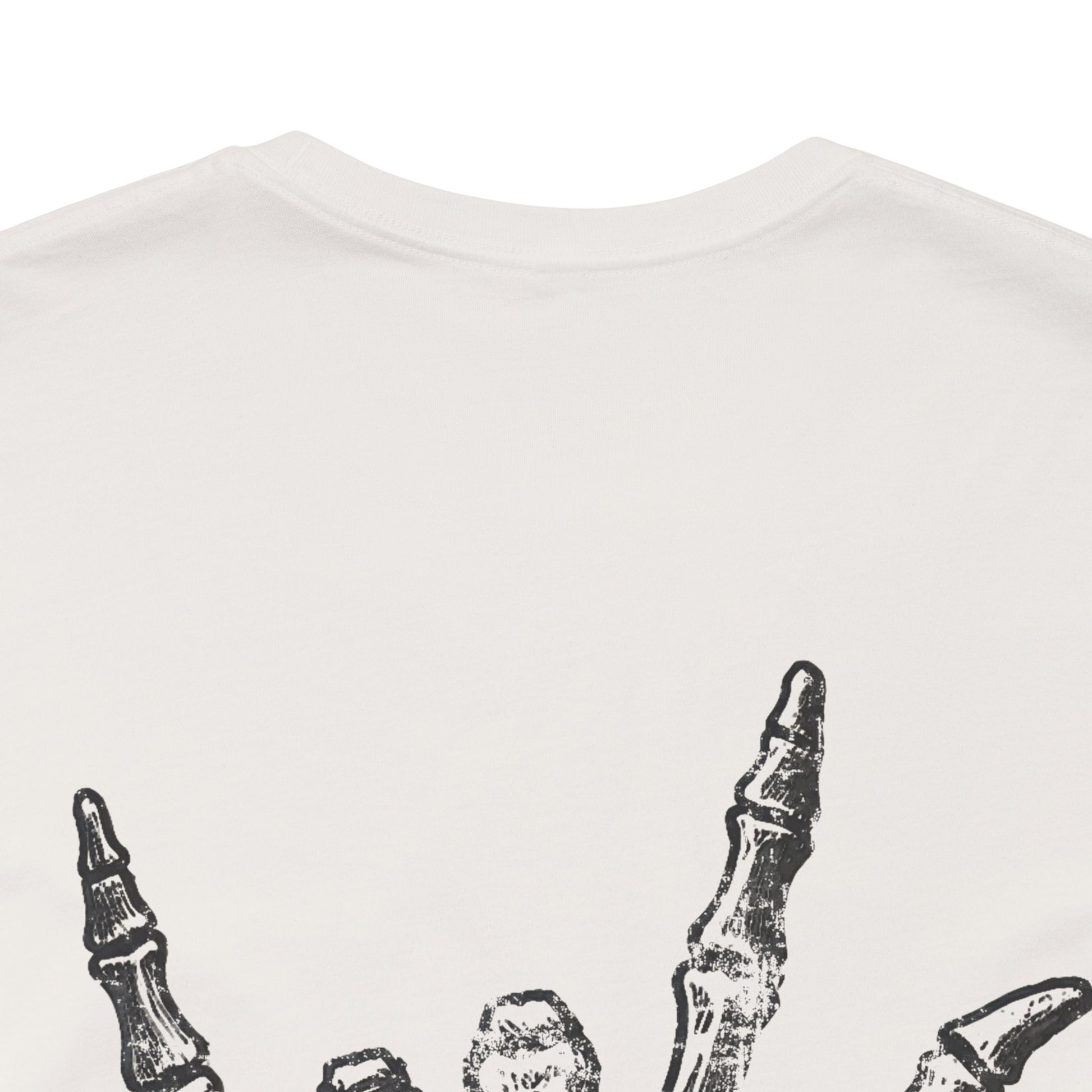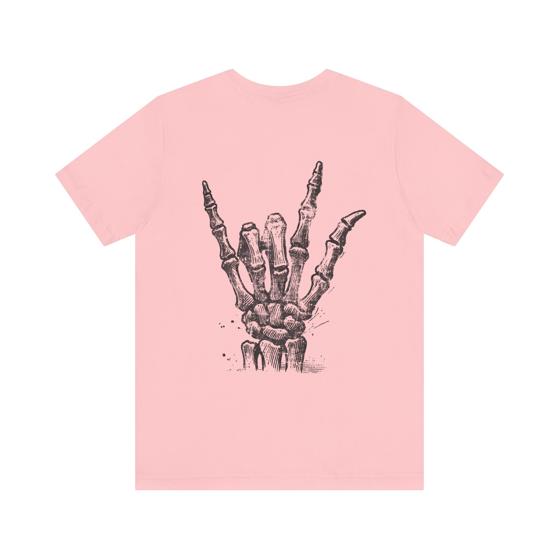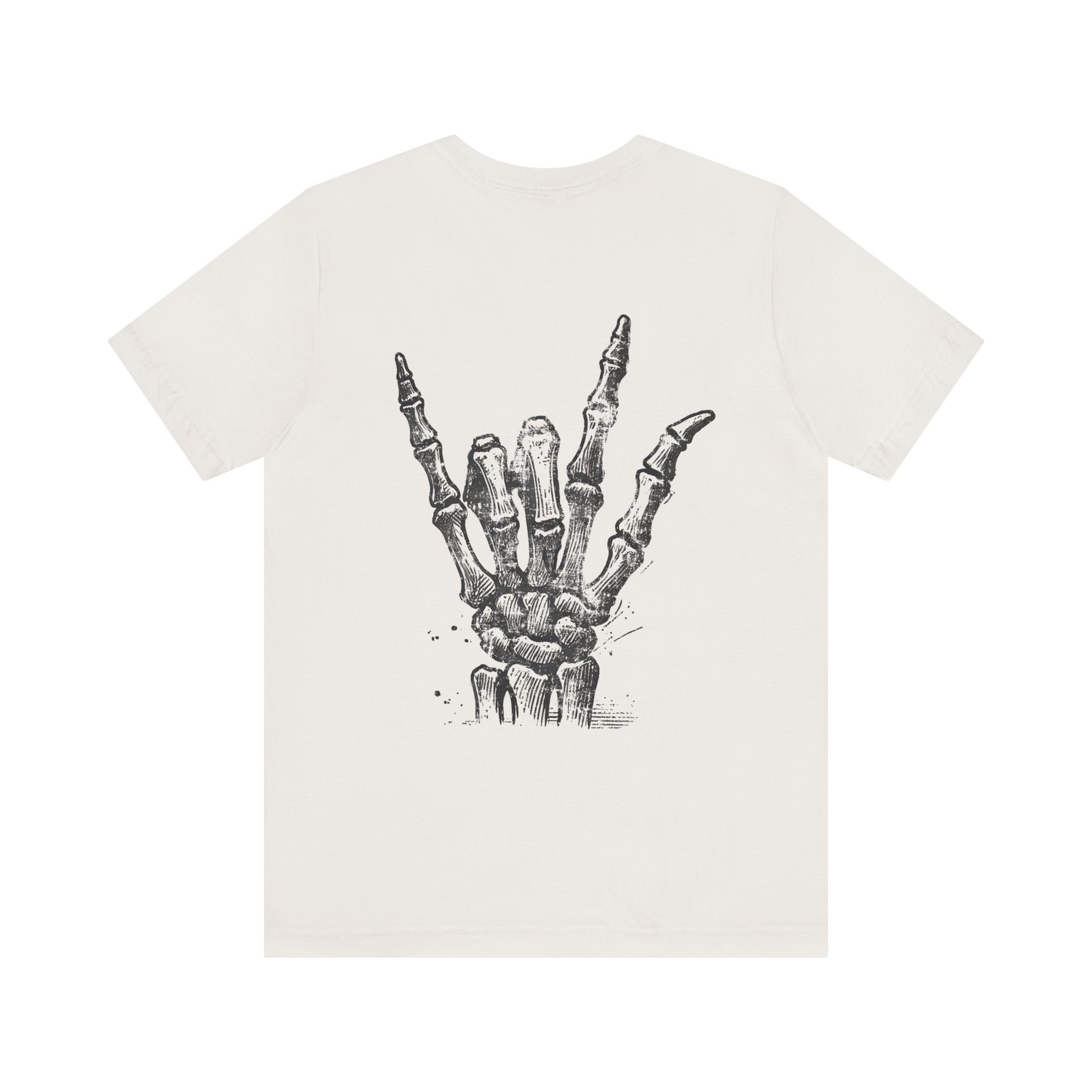 A metal Christian design on the front with a skeleton rock symbol hand on the back, giving off a unique and edgy vibe. Perfect for fans of rock music and alternative style and for those of Faith in Jesus. Ideal for wearing during music festivals, concerts, or casual outings.
