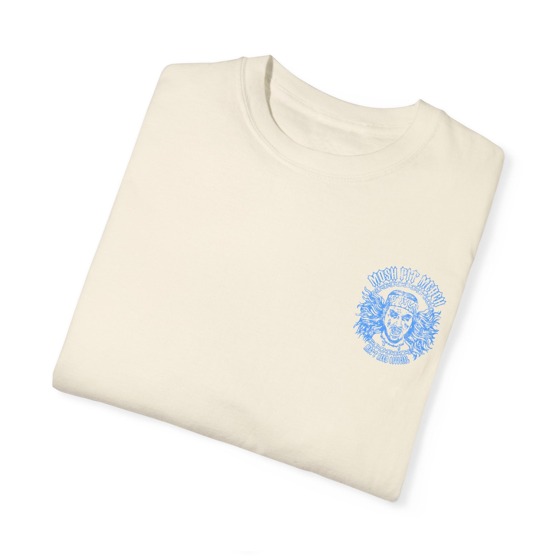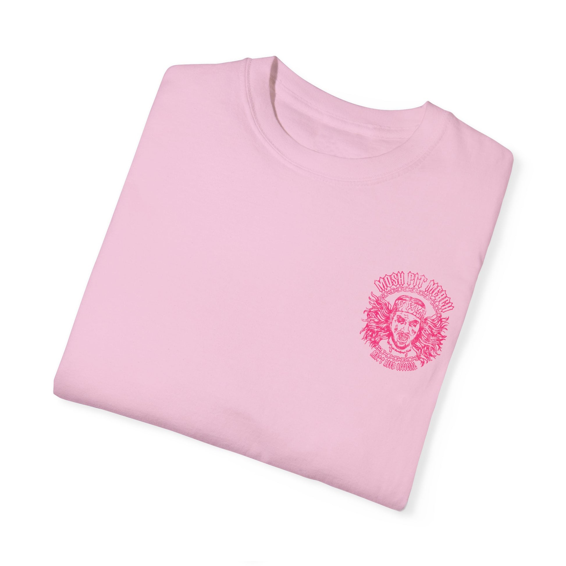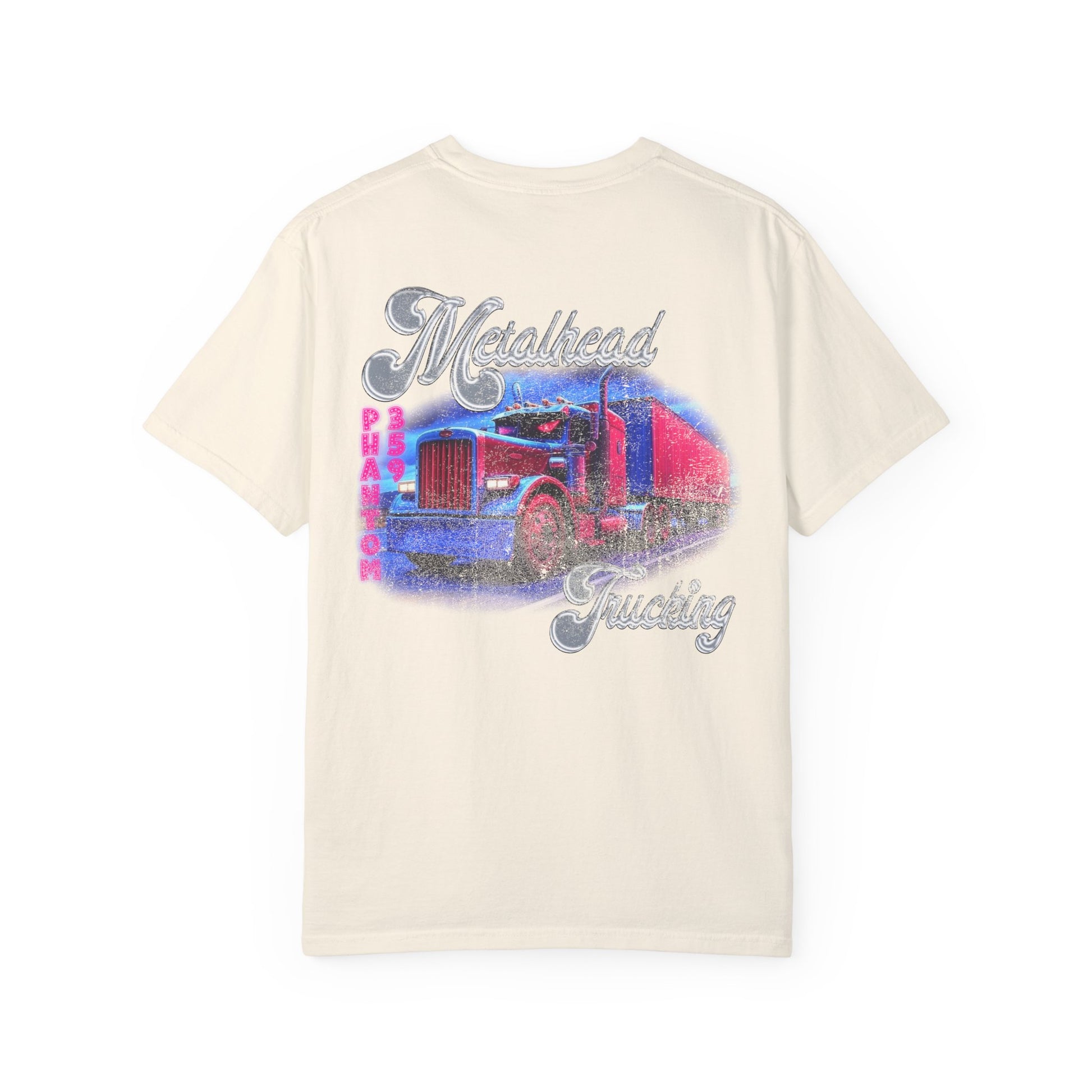 A metalhead trucking tee featuring the graphic "metalhead trucking" on the back with "Phantom 359" and the Mosh Pit Merch logo on the front. Perfect for fans of metal music and truckers looking for a unique design to express their style. Ideal for casual wear or as a conversation starter. Relevant for music festivals, trucking events, and everyday wear.
