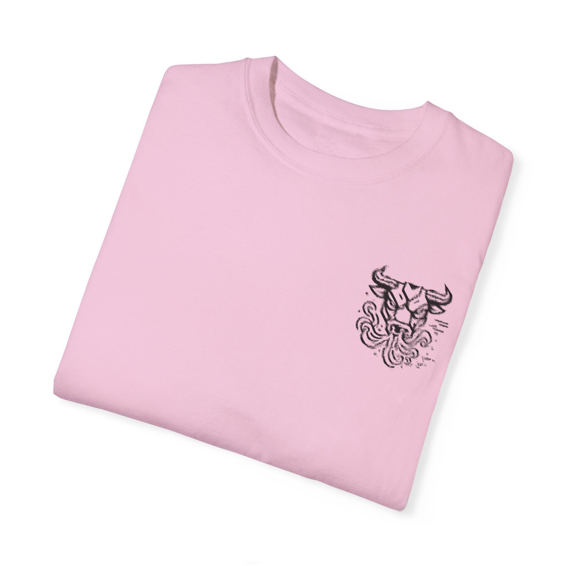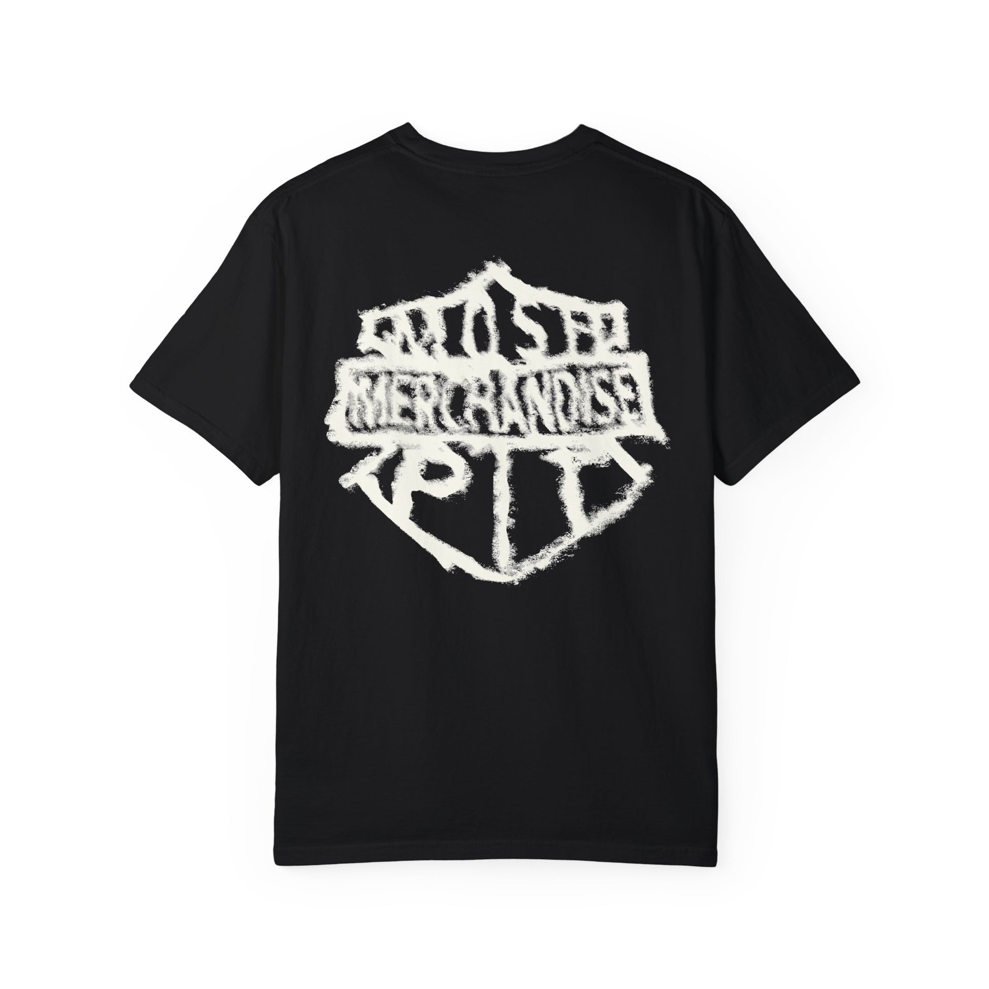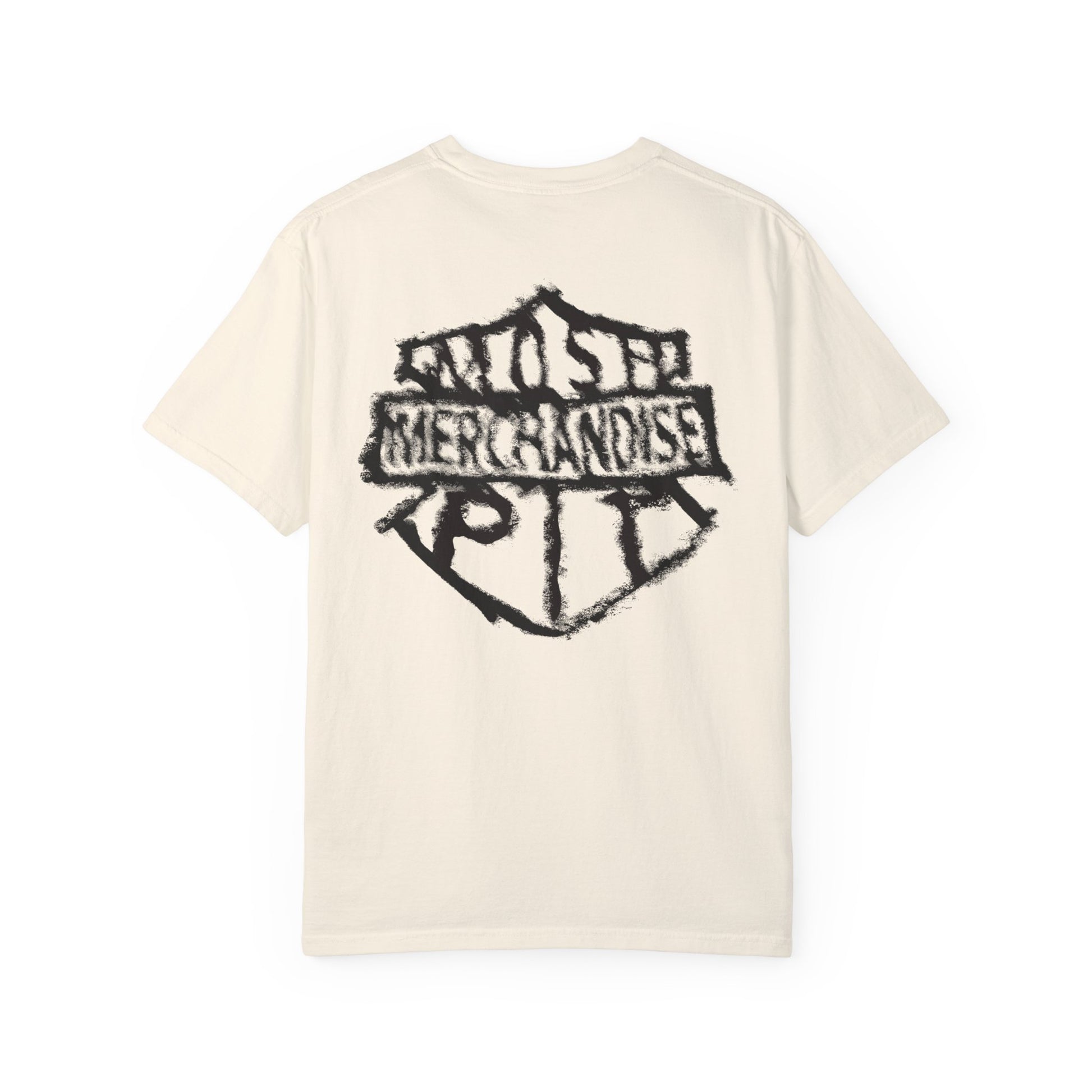 A vintage-inspired Unisex Garment-Dyed Heavyweight Cotton Tee featuring a sketched iron sheild with the phrase 'mosh pit merchandise' in a messy hand-drawn fashion. Perfect for music lovers and concert-goers looking to add a touch of edgy style to their wardrobe. Ideal for casual wear and attending rock concerts and music festivals.