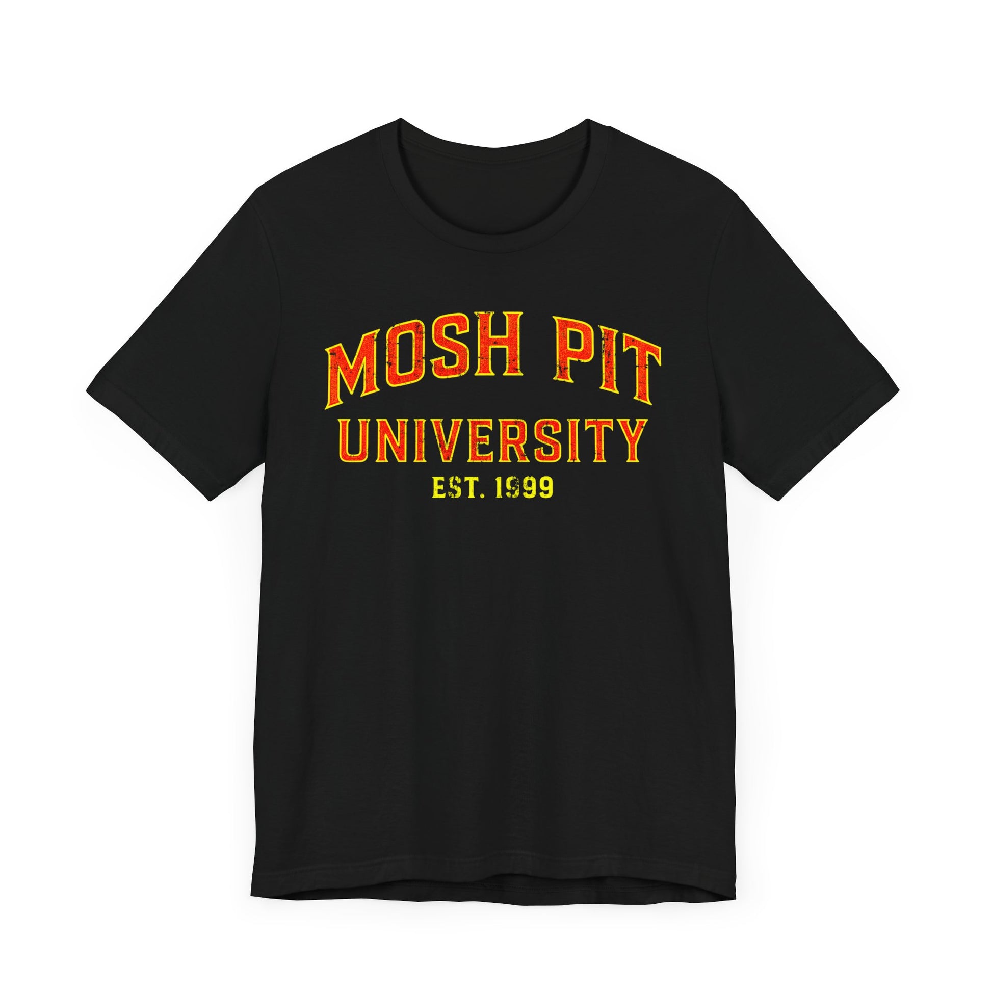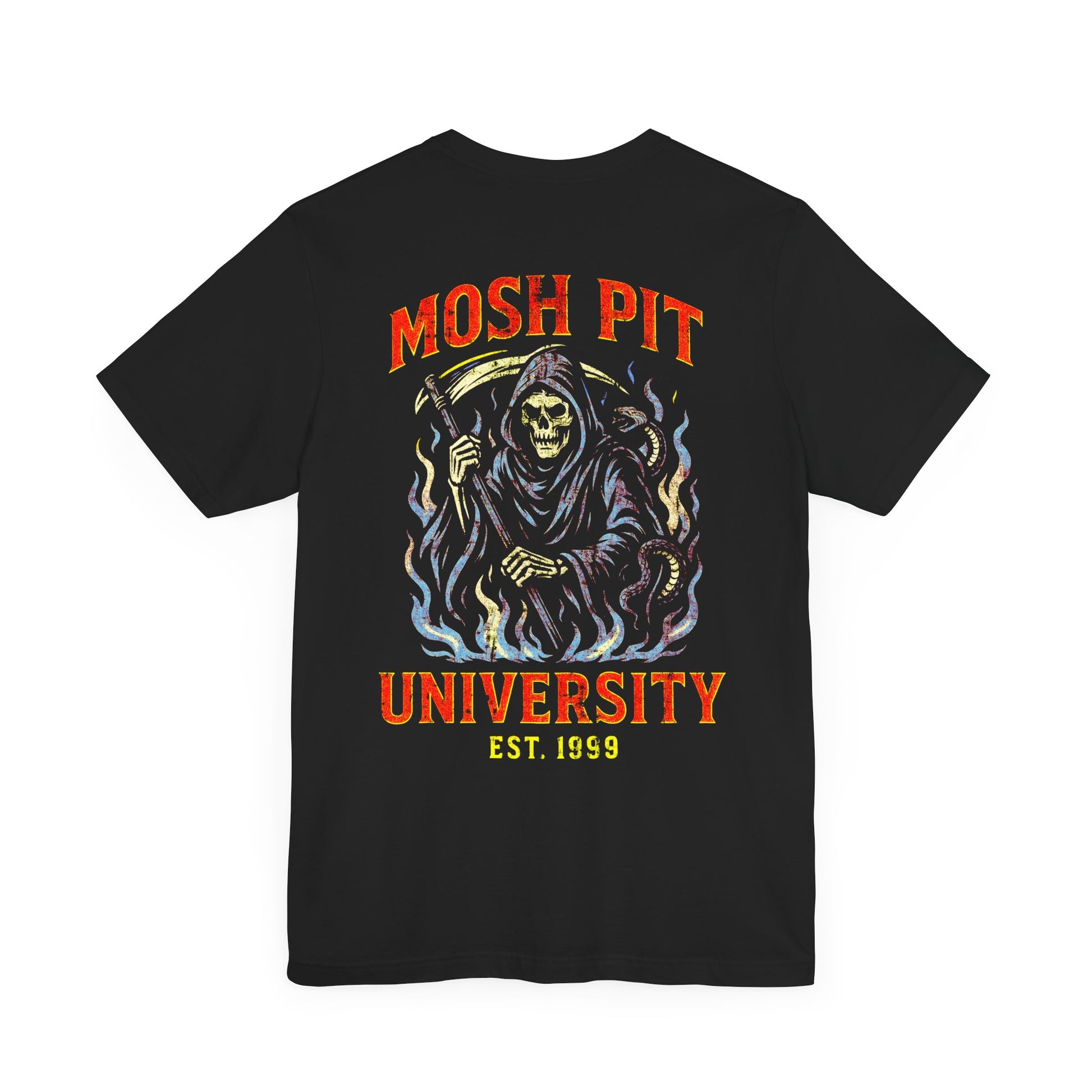 This Mosh Pit University classic tee features the University Grim Reaper mascot on the back. It gives off a rebellious and edgy vibe, perfect for fans of alternative music and hardcore scenes. Great for casual wear to concerts, music festivals, and rock-themed events.