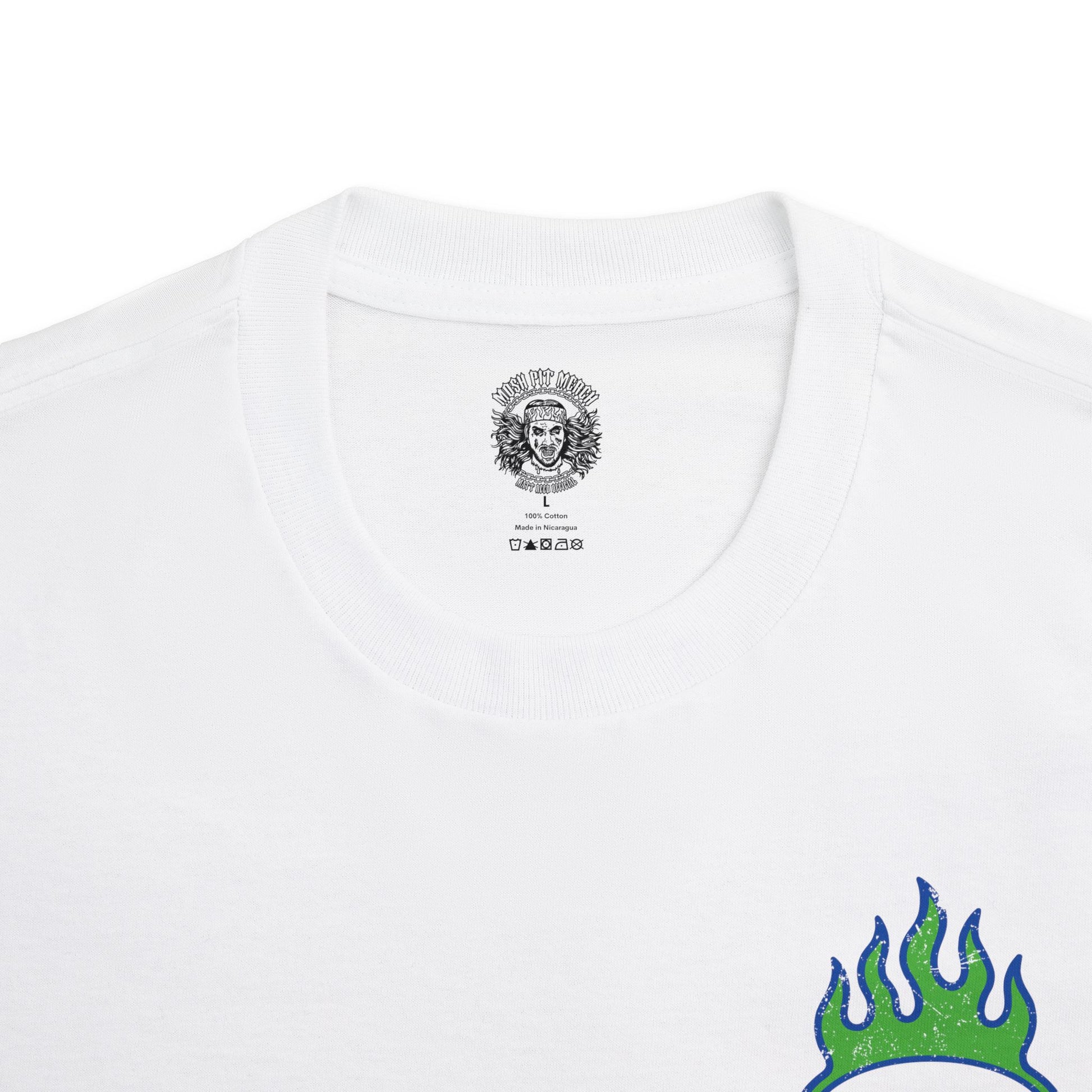 A classic T-Shirt featuring a green flame logo on the front and a green flame skull pattern on the back. Gives off an early 2000s skater vibe. This edgy and bold design is perfect for those who love unique and eye-catching clothing. Ideal for casual wear and for fans of alternative fashion. Suitable for occasions like concerts, music festivals, and casual hangouts with friends.